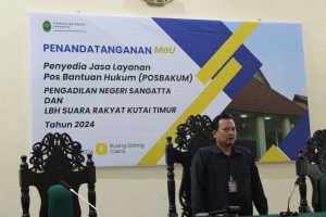 Bertempat diruang sidang cakra pukul 09.00 WITA telah dilaksanakan acara penandatanganan MoU antara Pengadilan Negeri Sangatta dengan Lembaga Bantuan Hukum Suara Rakyat Kutai Timur dan dihadiri oleh seluruh Hakim, Pegawai Pengadilan Negeri Sangatta dan Ketua LBH (Abdul Karim, S.H., M.H) beserta anggota LBH Suara Rakyat Kutai Timur.